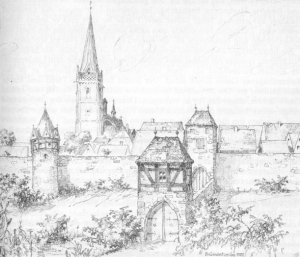 Ab 1300 begann in Nieder-Wildungen der Bau der Stadtmauer. Zu den Befestigungsanlagen gehörten naturgemäß auch Türme und Tore. Das Bild zeigt das damalige Brunnentor, wie es circa 1500 ausgesehen haben soll. An dieser Stelle ist heute der Postplatz zu finden.